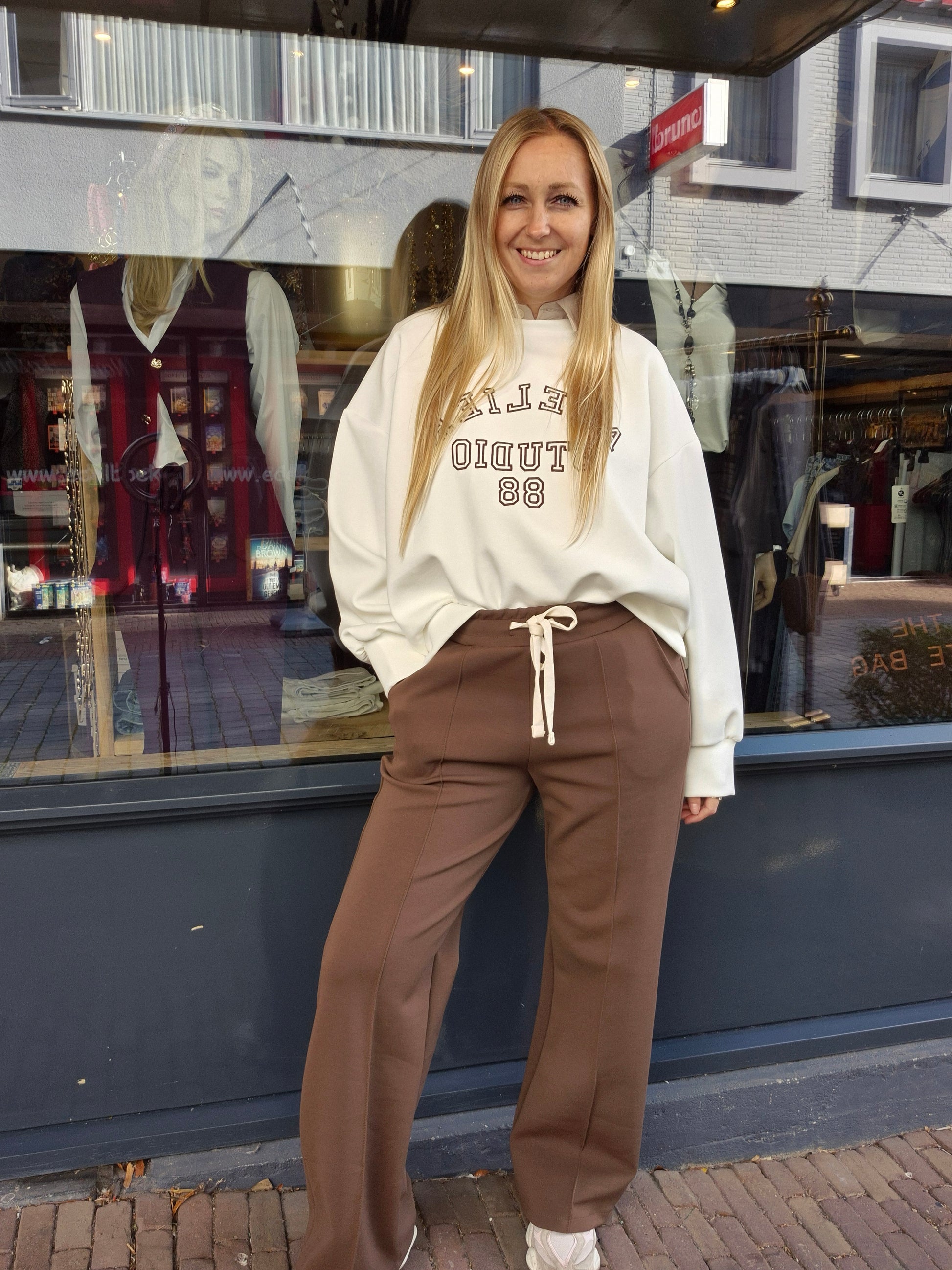 Details: Trui met de tekst atelier. Sharona heeft hem gecombineerd met een blouse eronder.