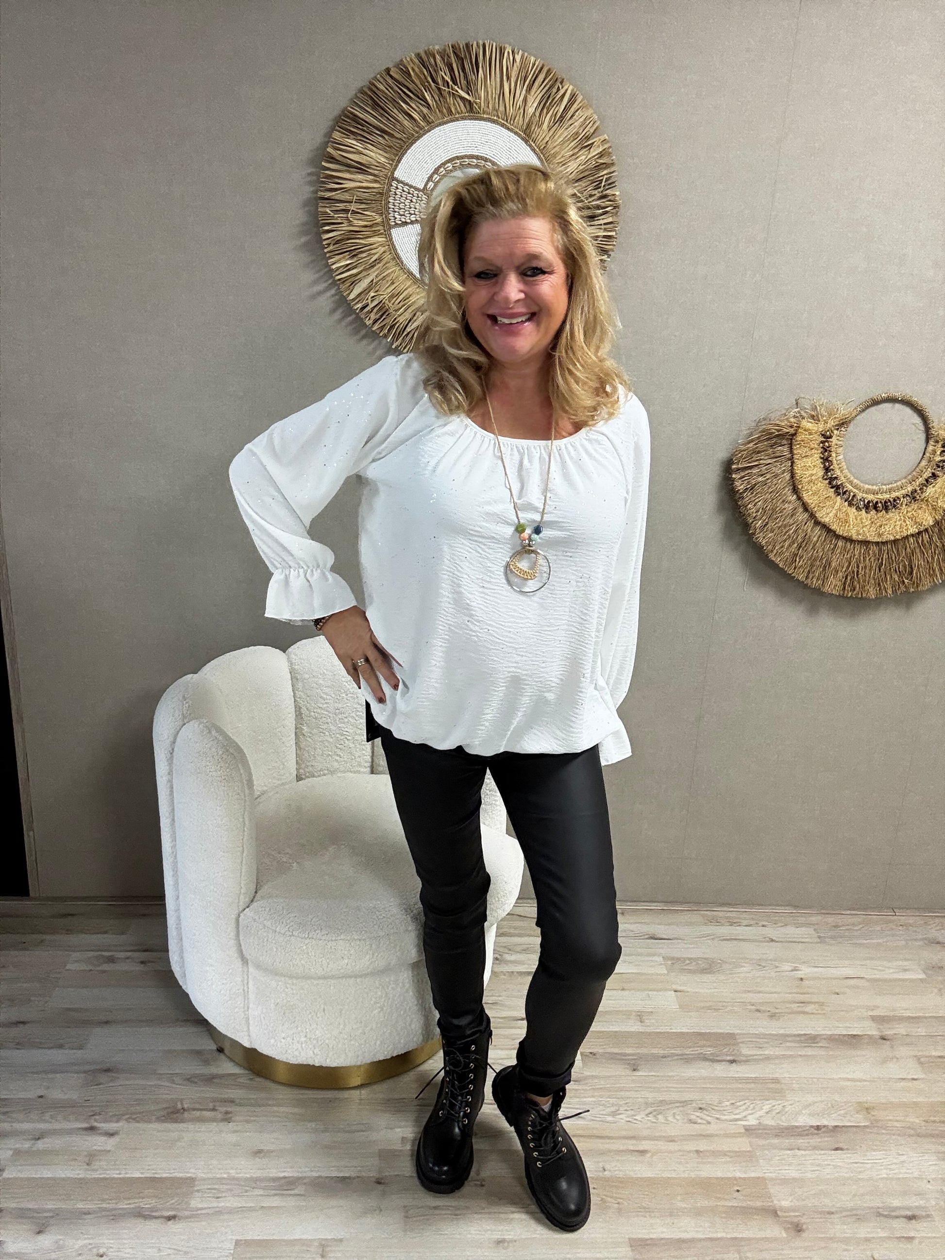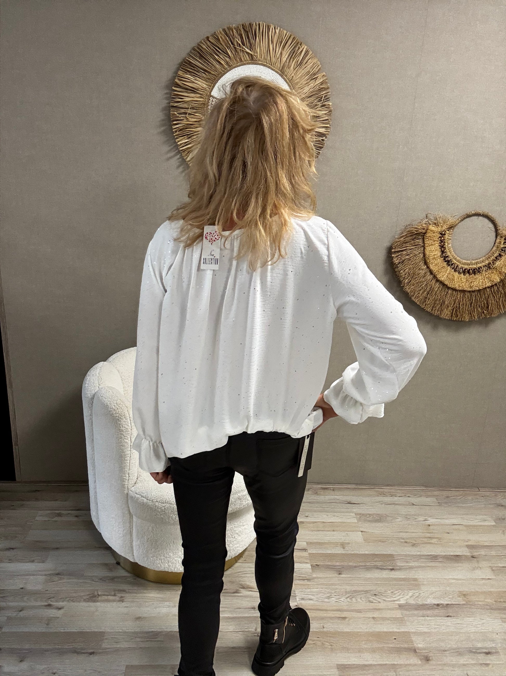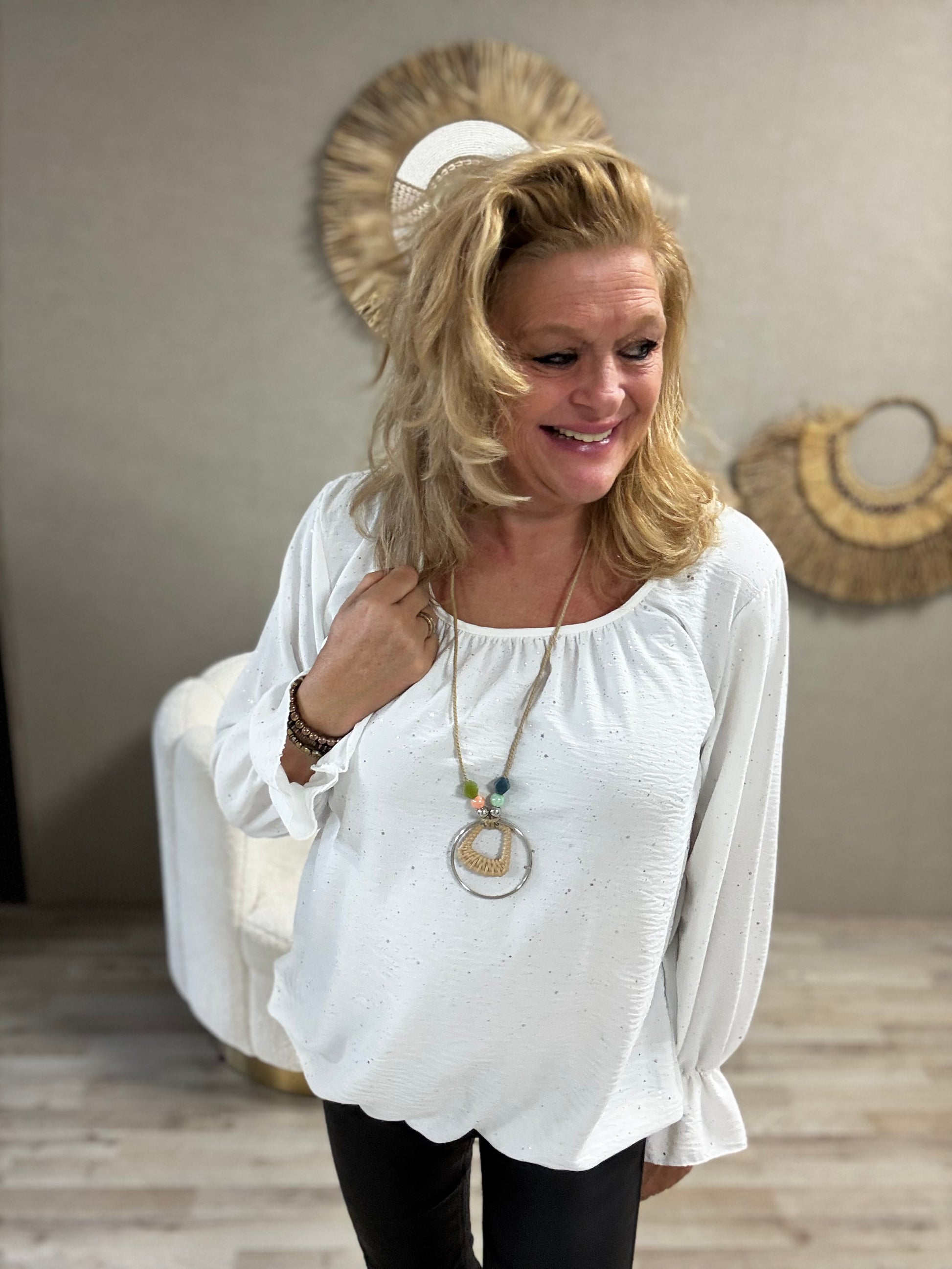 Details: Deze vrouwelijke ballon top is een echte blikvanger! Dankzij het elastiek aan de onderkant valt hij mooi bloezend, terwijl de roesel mouwtjes zorgen voor een speelse, romantische look. En als extraatje krijg je er een gratis ketting bij – voor de perfecte finishing touch!