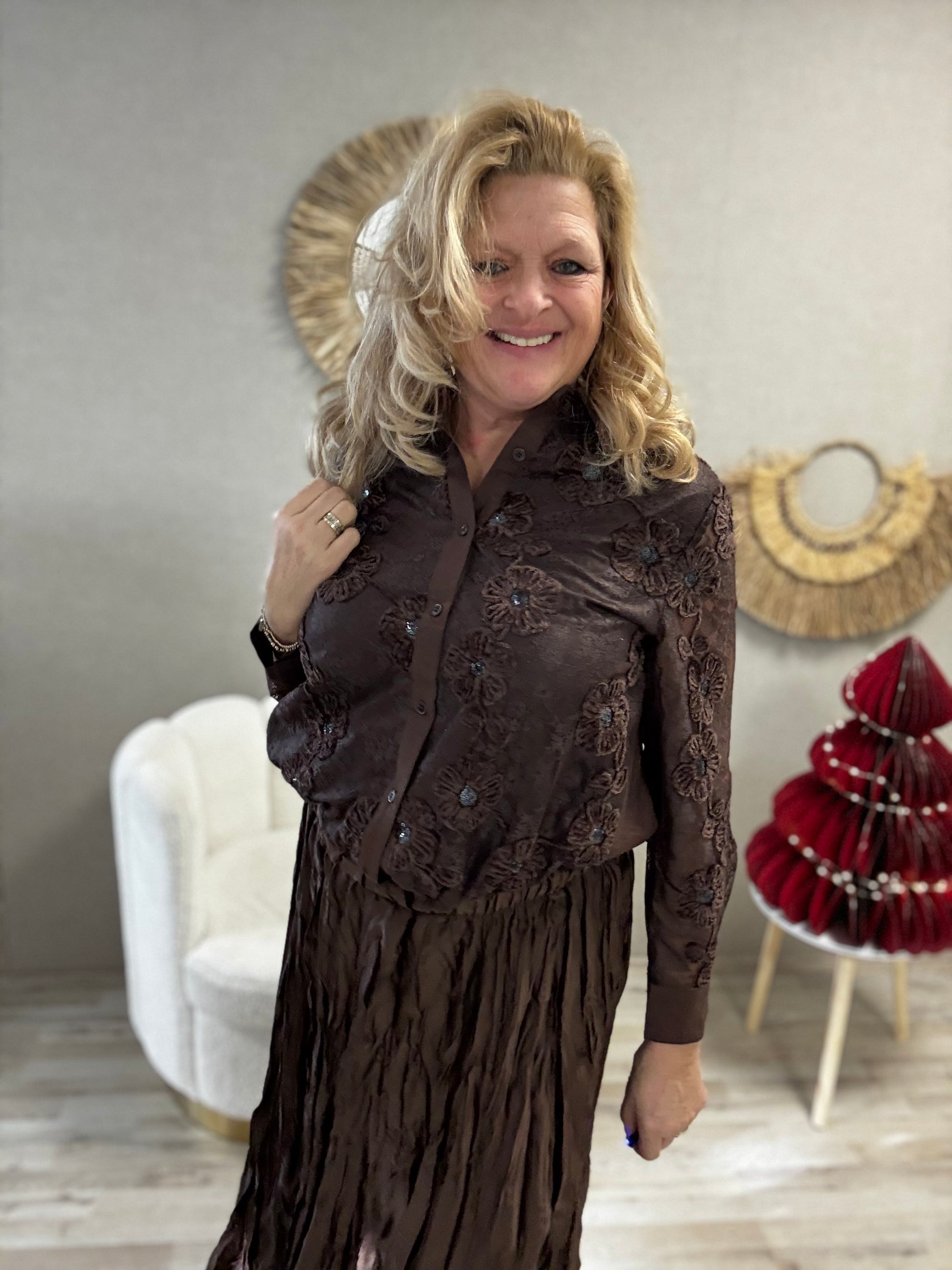 Deze prachtige blouse straalt pure elegantie uit. Zowel aan de voorkant als aan de achterkant is de blouse rijk versierd met geborduurde bloemen en subtiel glinsterende pailletten, wat zorgt voor een luxe en bijzondere uitstraling.De mouwen zijn gemaakt van doorzichtig kant, en ook hier komen de mooie bloemenborduursels terug. Dit zorgt voor een verfijnde, vrouwelijke look die perfect aansluit bij het geheel.