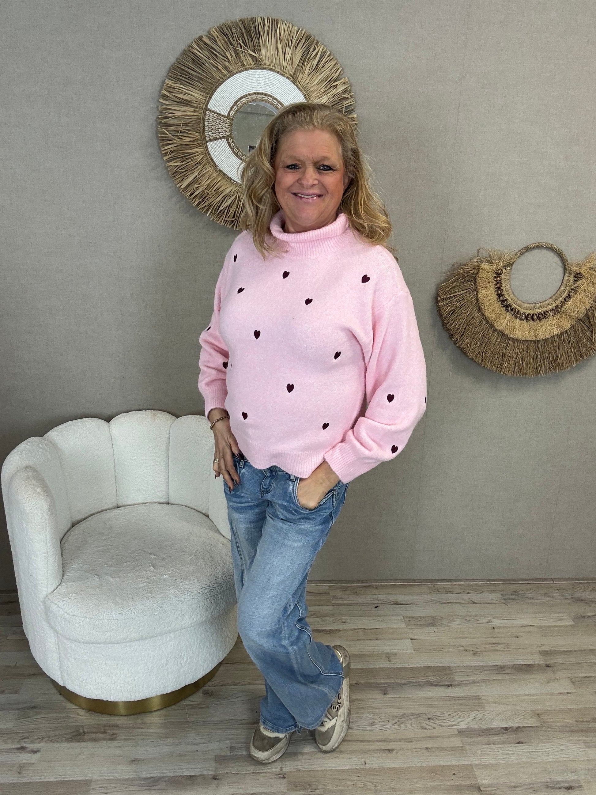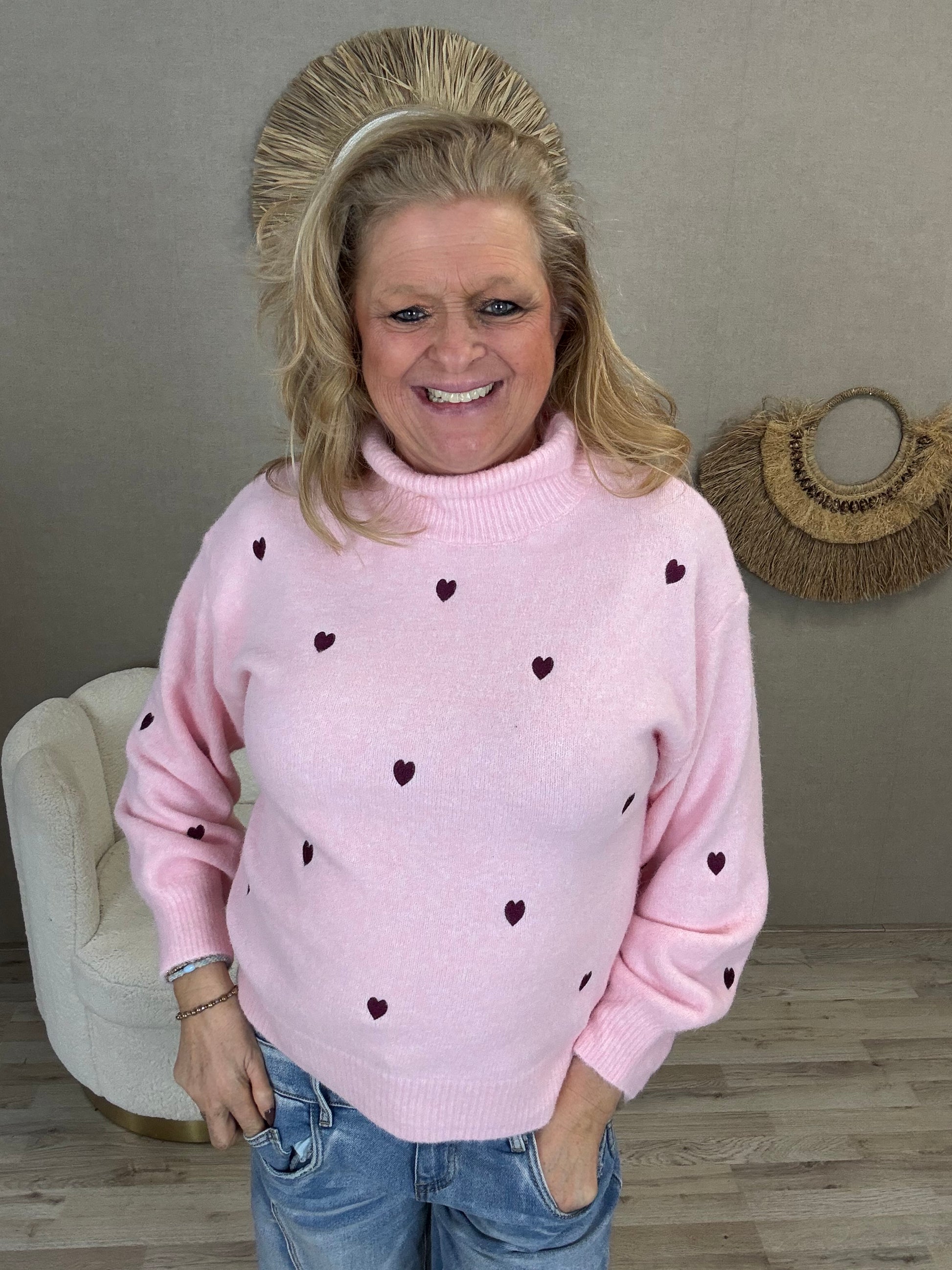 Details: LOVE IT! Deze sweater heeft een super leuke hartjes op de trui en in een geweldige lente kleur. Super zacht.