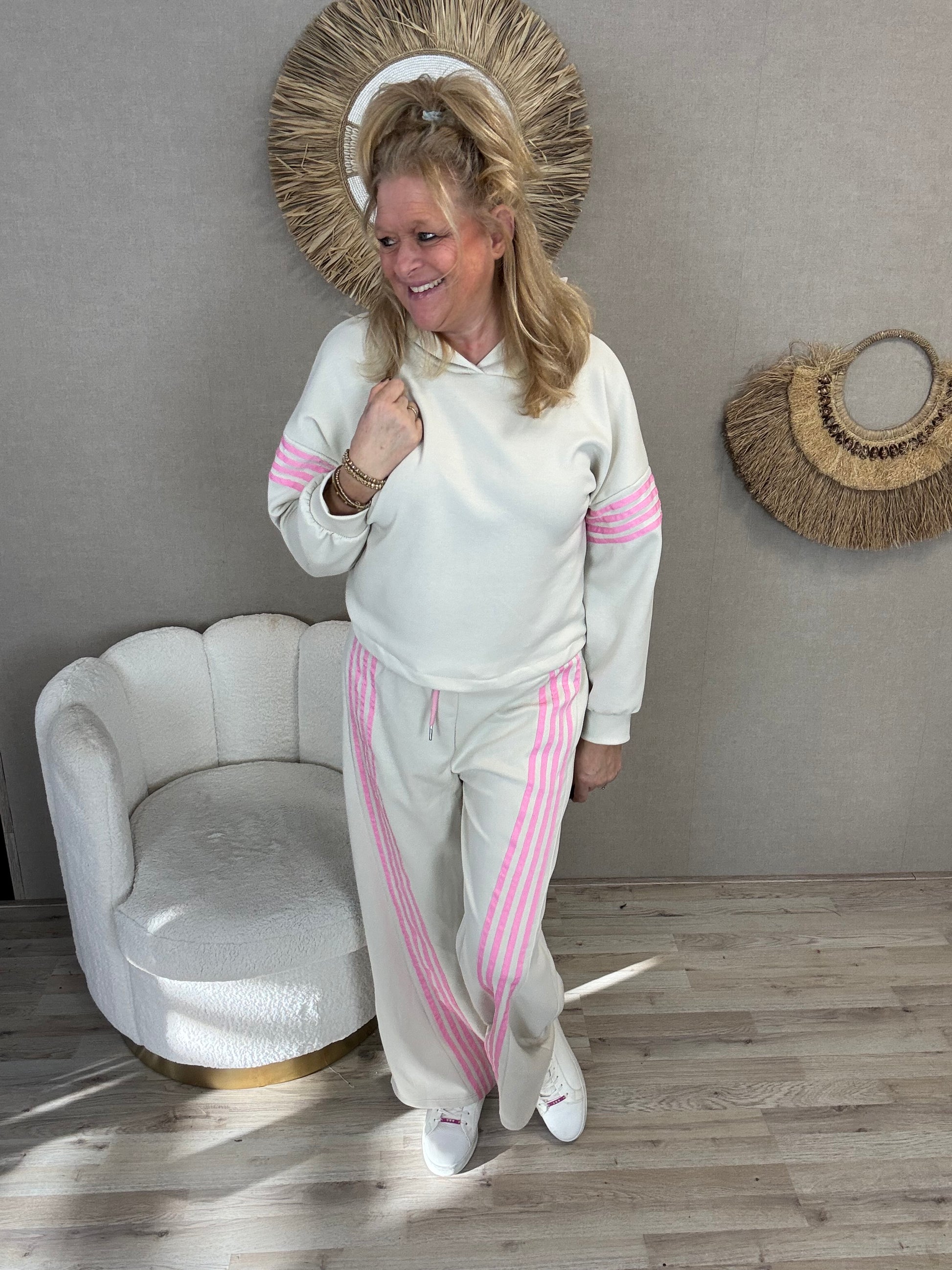 Deze super comfortabele lounge set is perfect voor wie stijl en comfort wil combineren. De set bestaat uit een zachte hoodie en een bijpassende broek in een mooie roze tint. De sportieve witte strepen op de mouwen en langs de broekspijpen geven de set een trendy, casual uitstraling.
