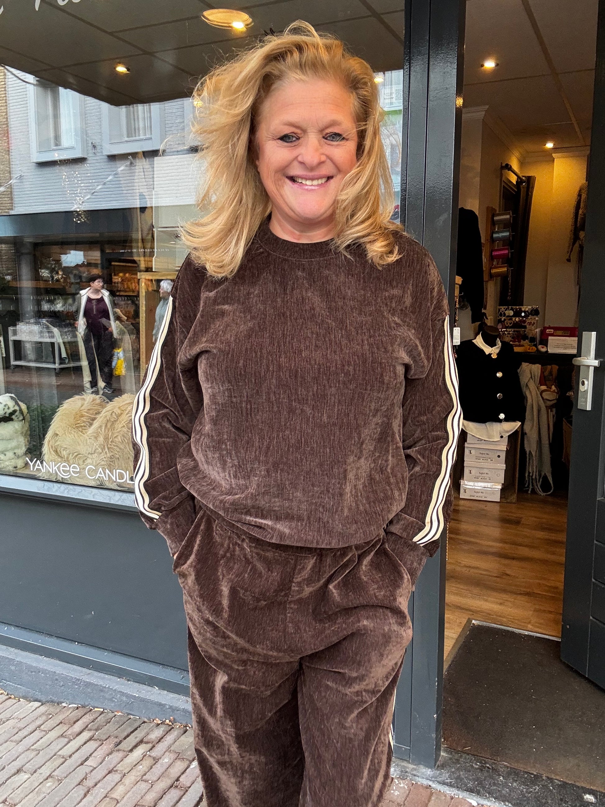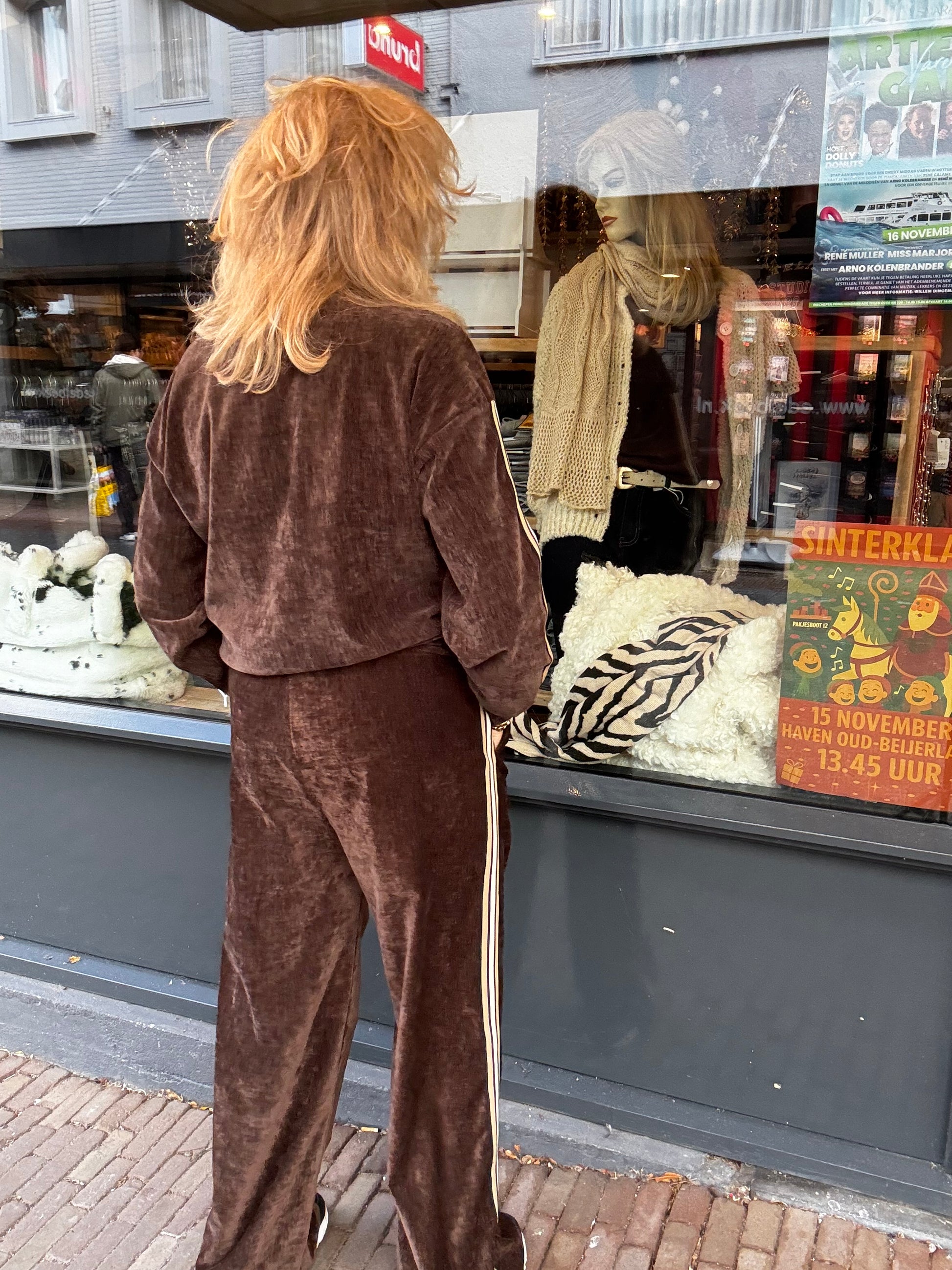 De fluweel look en dunne ribstof geven het een luxe uitstraling, terwijl de strepen aan de zijkant en wide leg pasvorm zorgen voor een moderne, casual vibe.