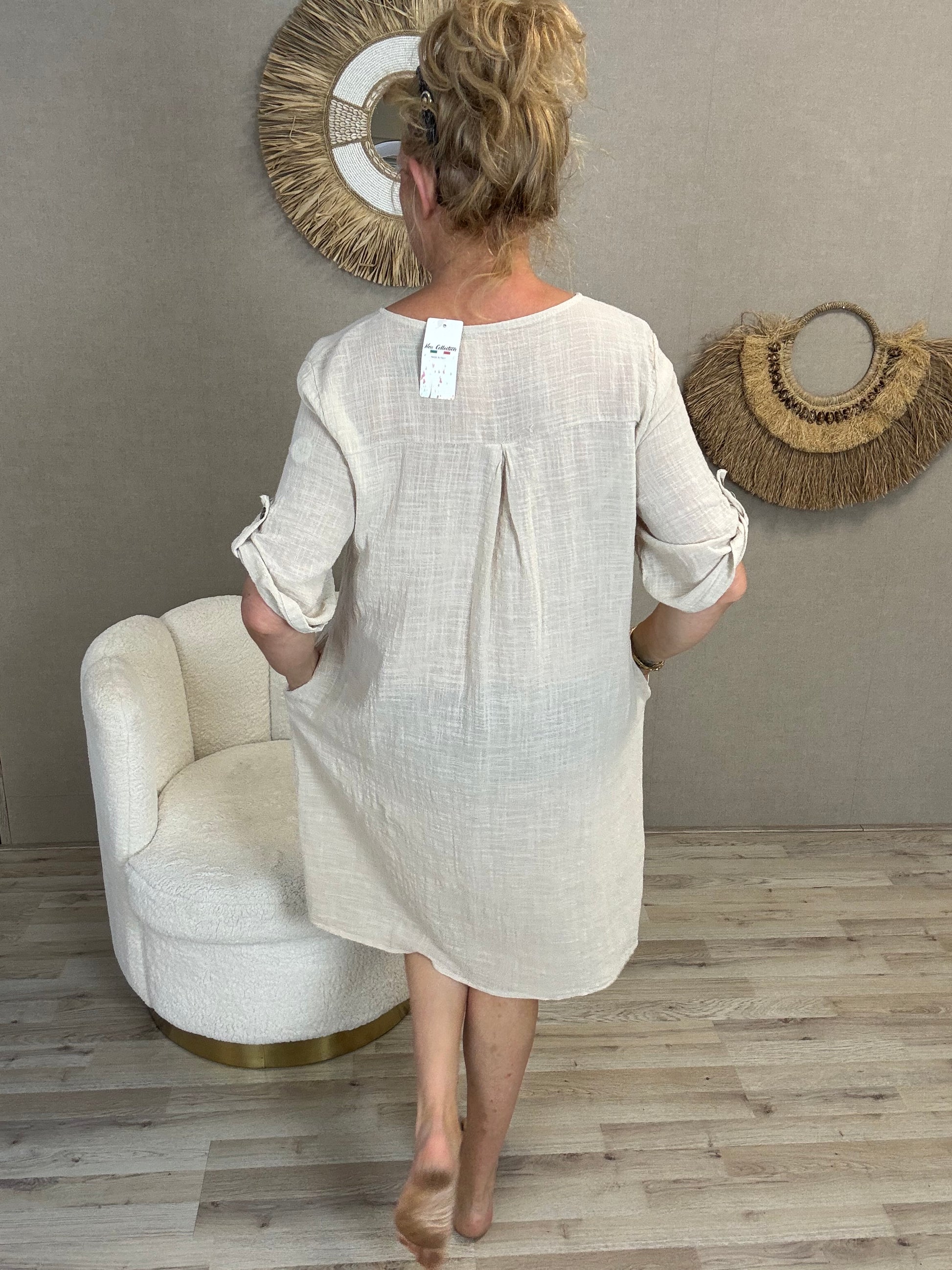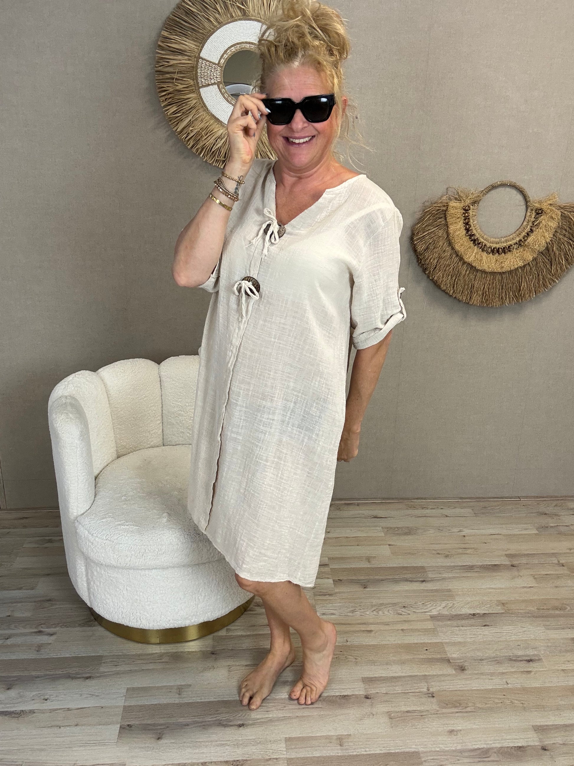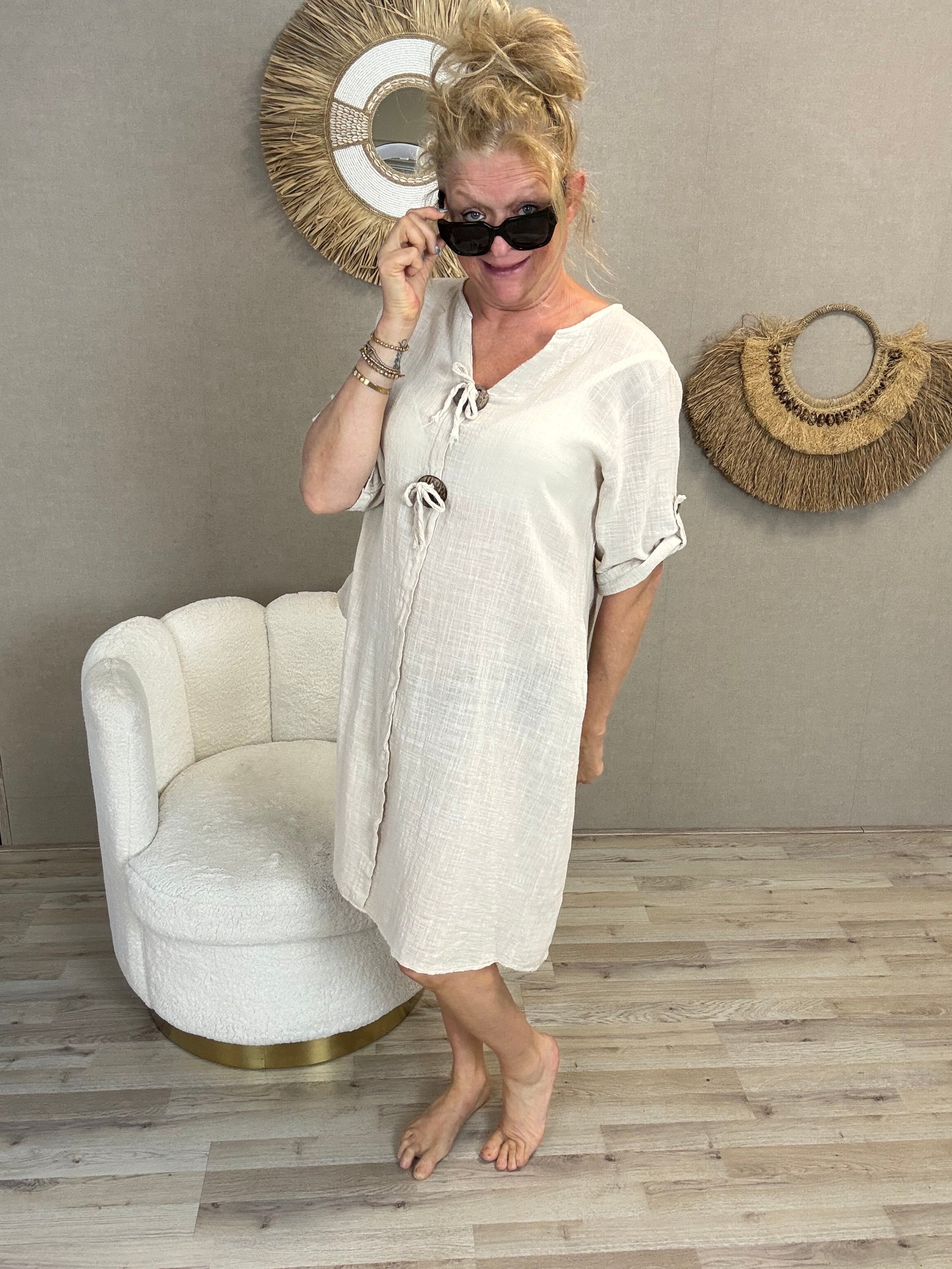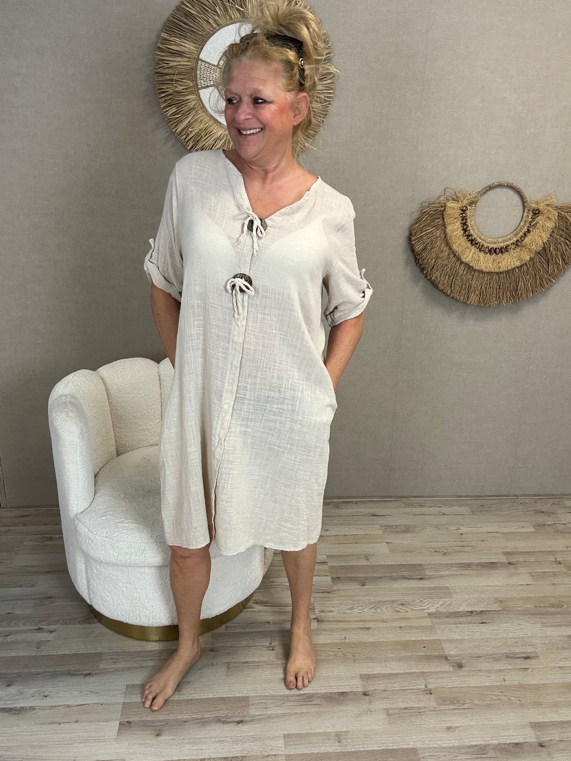 Het jurkje heeft een relaxte, losvallende pasvorm en is voorzien van praktische zakjes – altijd fijn! De houten knoopdetails en het strikje bij de hals geven een speelse en natuurlijke uitstraling. De mouwtjes kun je makkelijk oprollen en vastzetten met een knoopje, voor een nonchalante en zomerse look.
