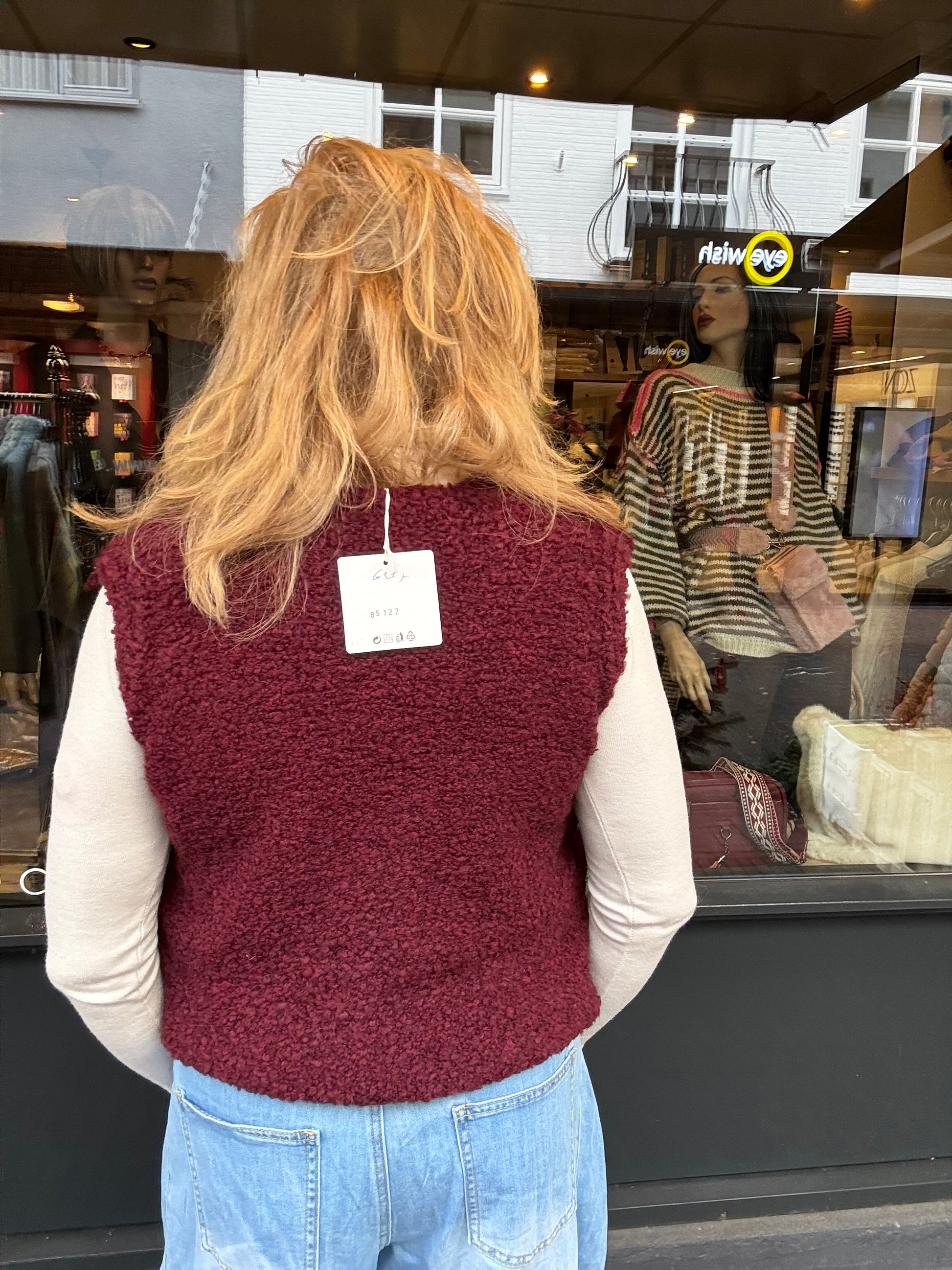 Details: Dit stijlvolle mouwloze vest is een echte eyecatcher voor het najaar en de winter. Dankzij de zachte, speelse structuur en de warme bordeauxkleur is het vest perfect om elke outfit een modieuze touch te geven. Ideaal om te dragen over een basic top of coltrui voor een comfortabele maar trendy look.