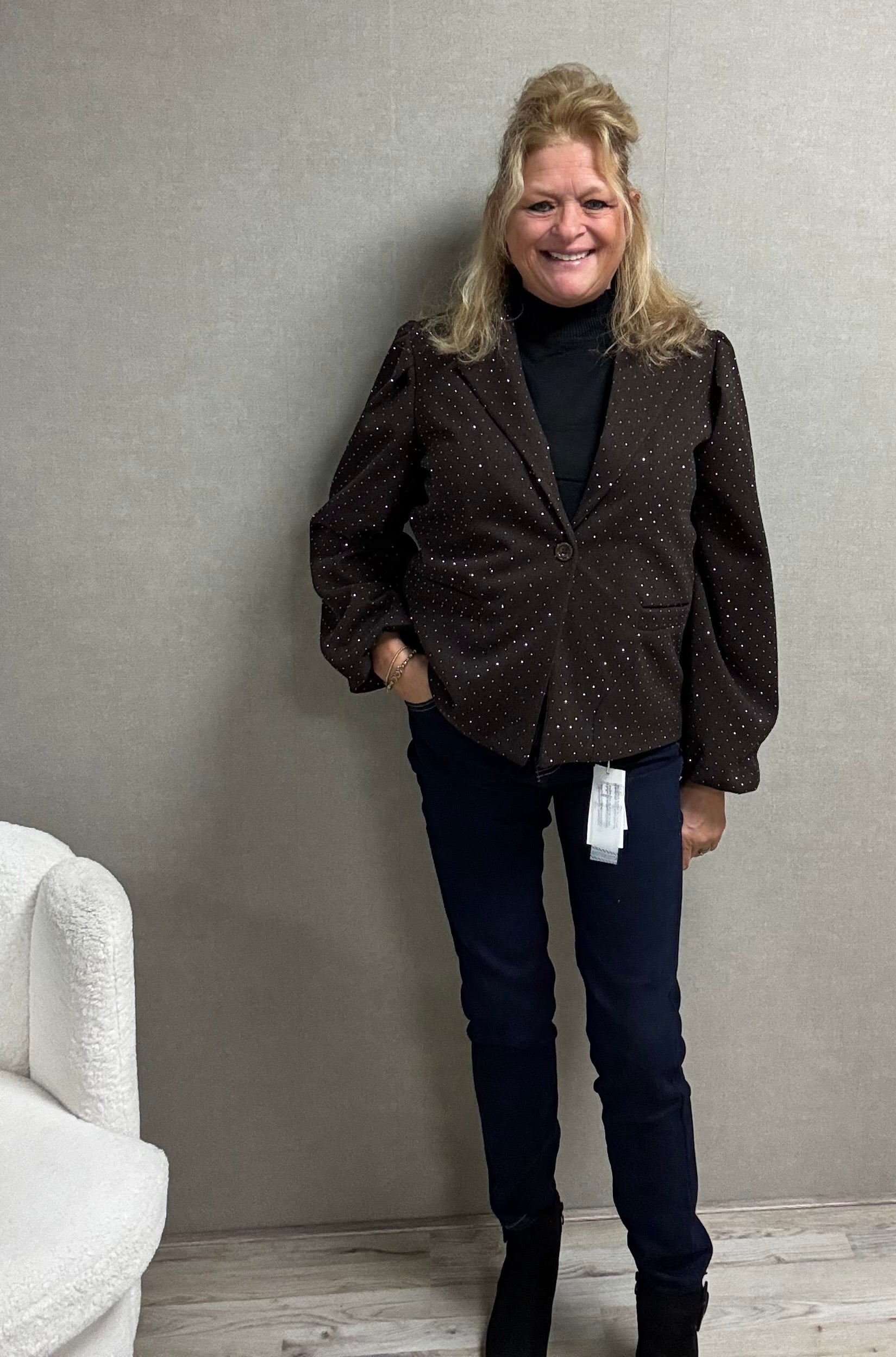 Nance is 1.68 en draagt confectie maat 38/40 en heeft hier de 38 aan.