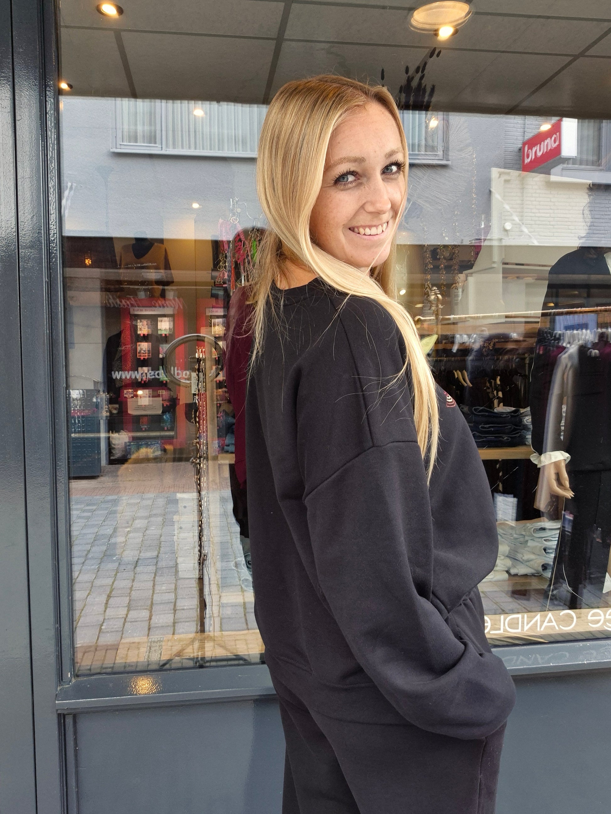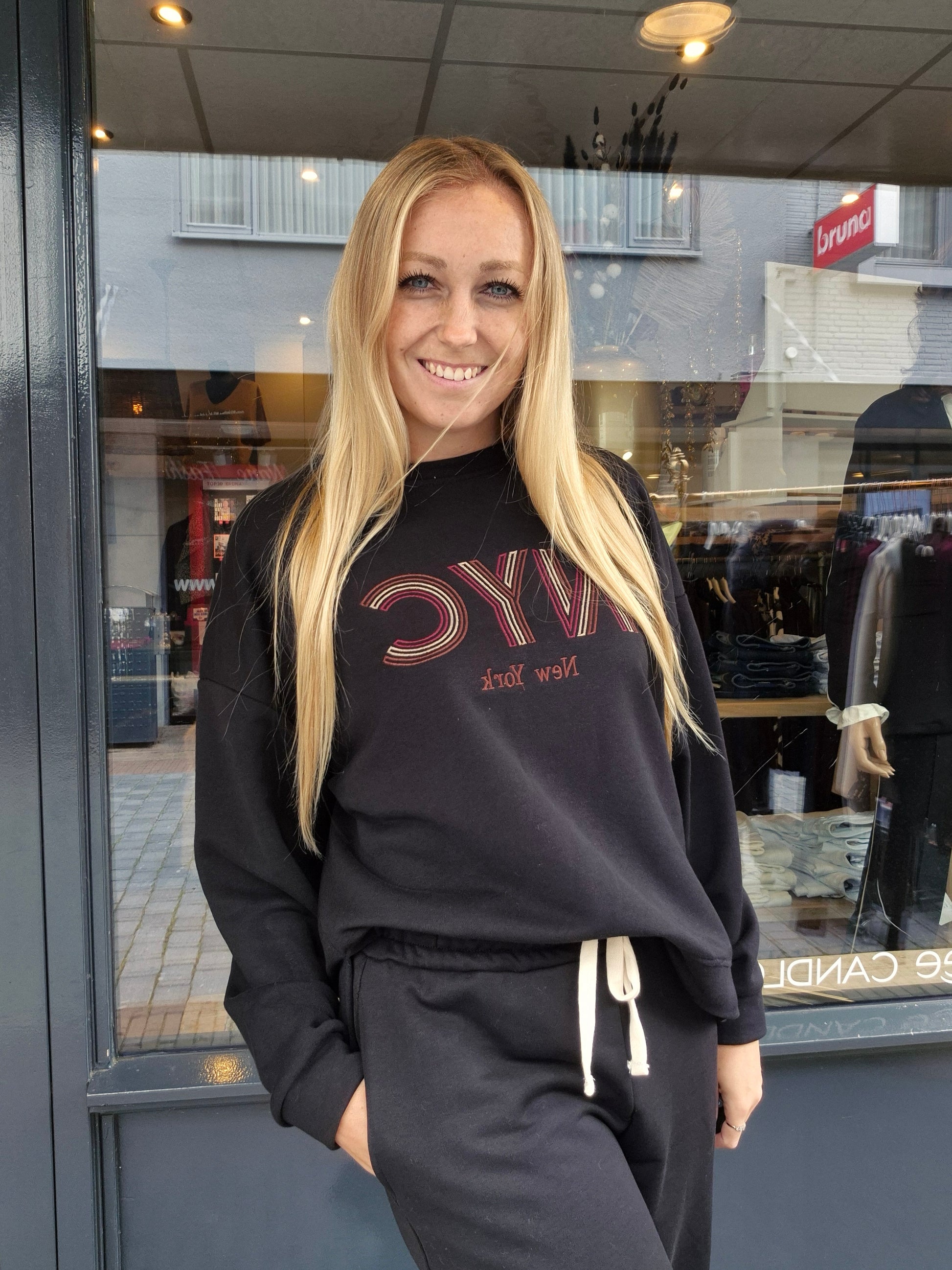 Details: trui met de tekst NYC. Aan beide zijden een klein splitje. Ook leuk te combineren met een blouse eronder.