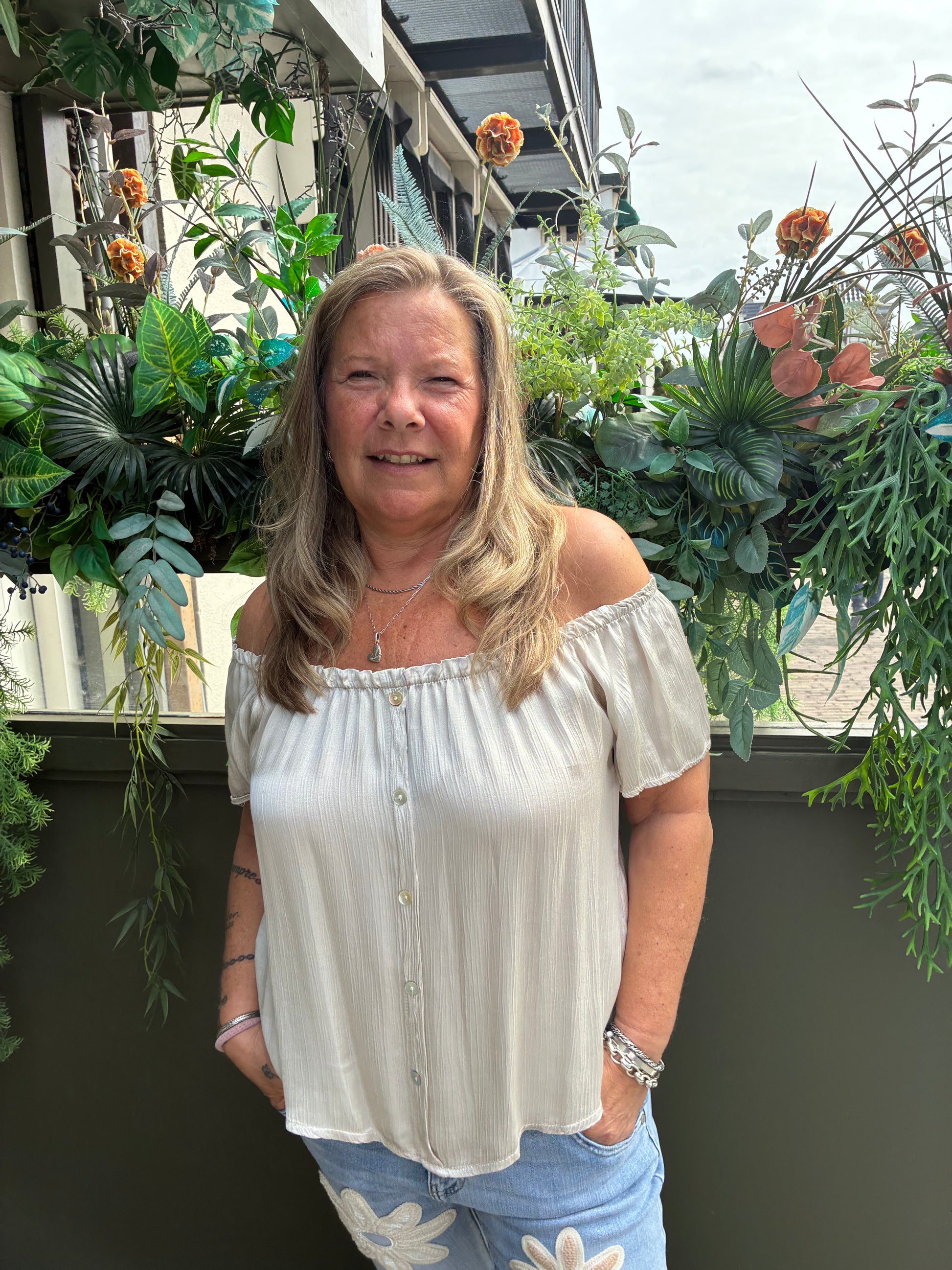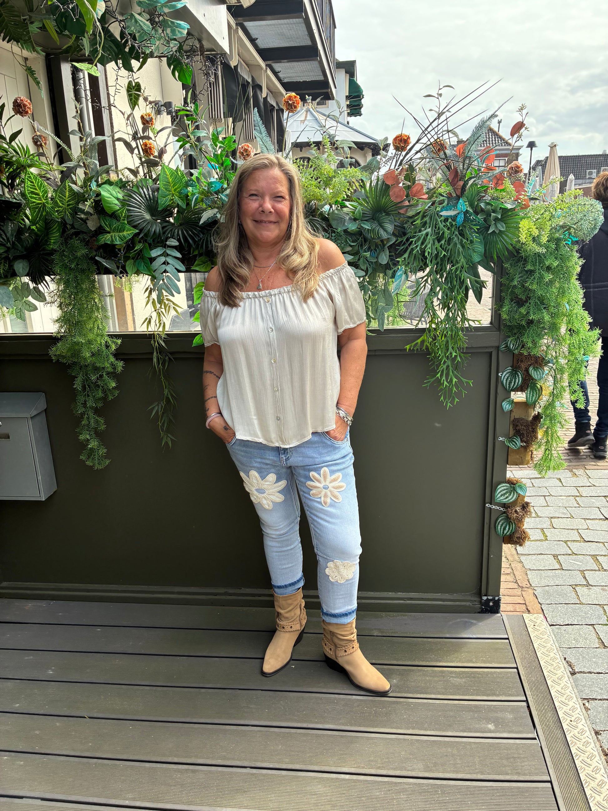 Details:Deze vrouwelijke viscose top met subtiele glans is een echte eyecatcher. De soepelvallende stof voelt heerlijk licht aan en geeft een luxe uitstraling dankzij de zachte glans. De off-shoulder halslijn zorgt voor een speelse, zomerse look en laat de schouders mooi uitkomen.Perfect te combineren met een witte broek of jeans voor een frisse, stijlvolle outfit.