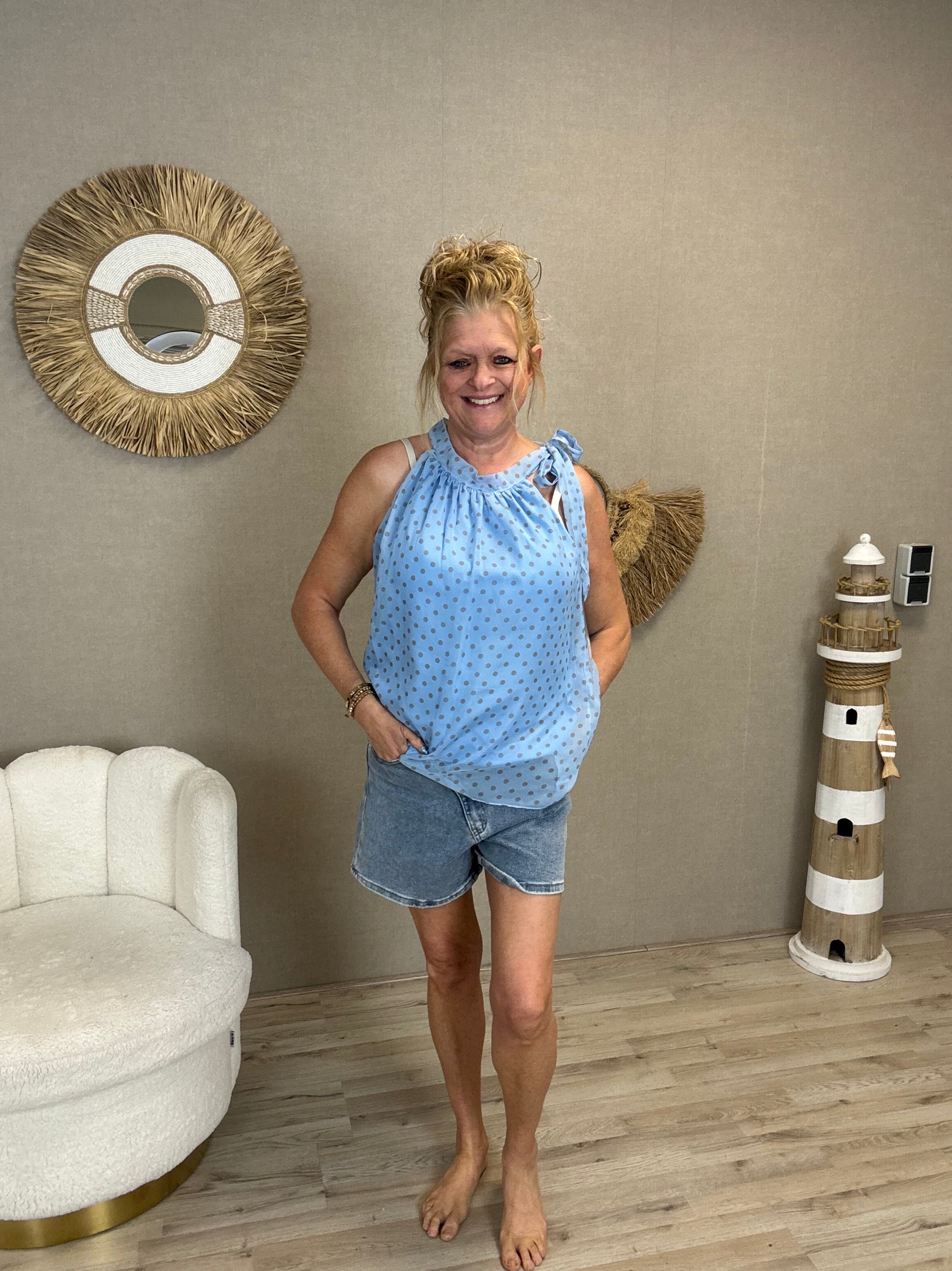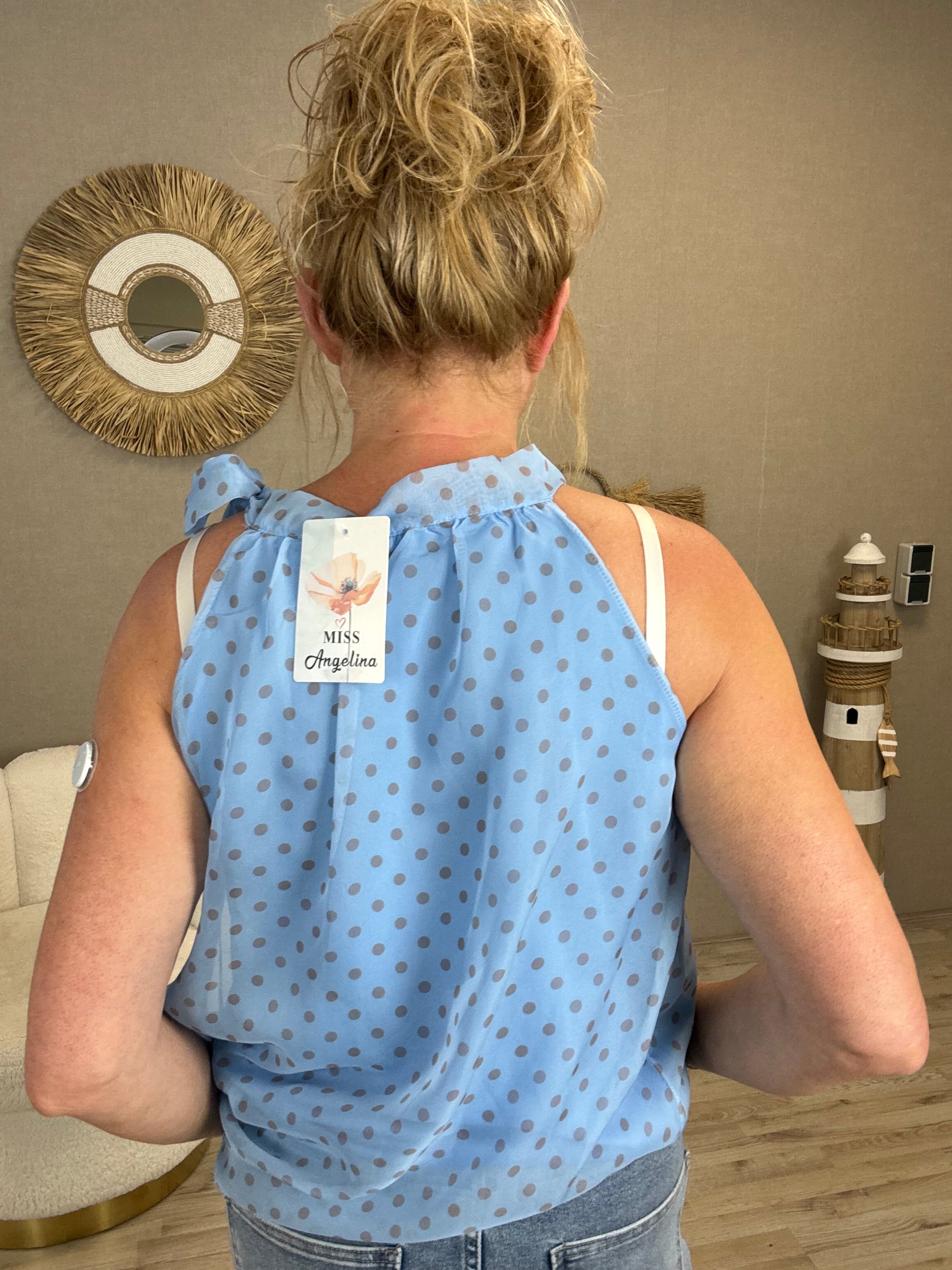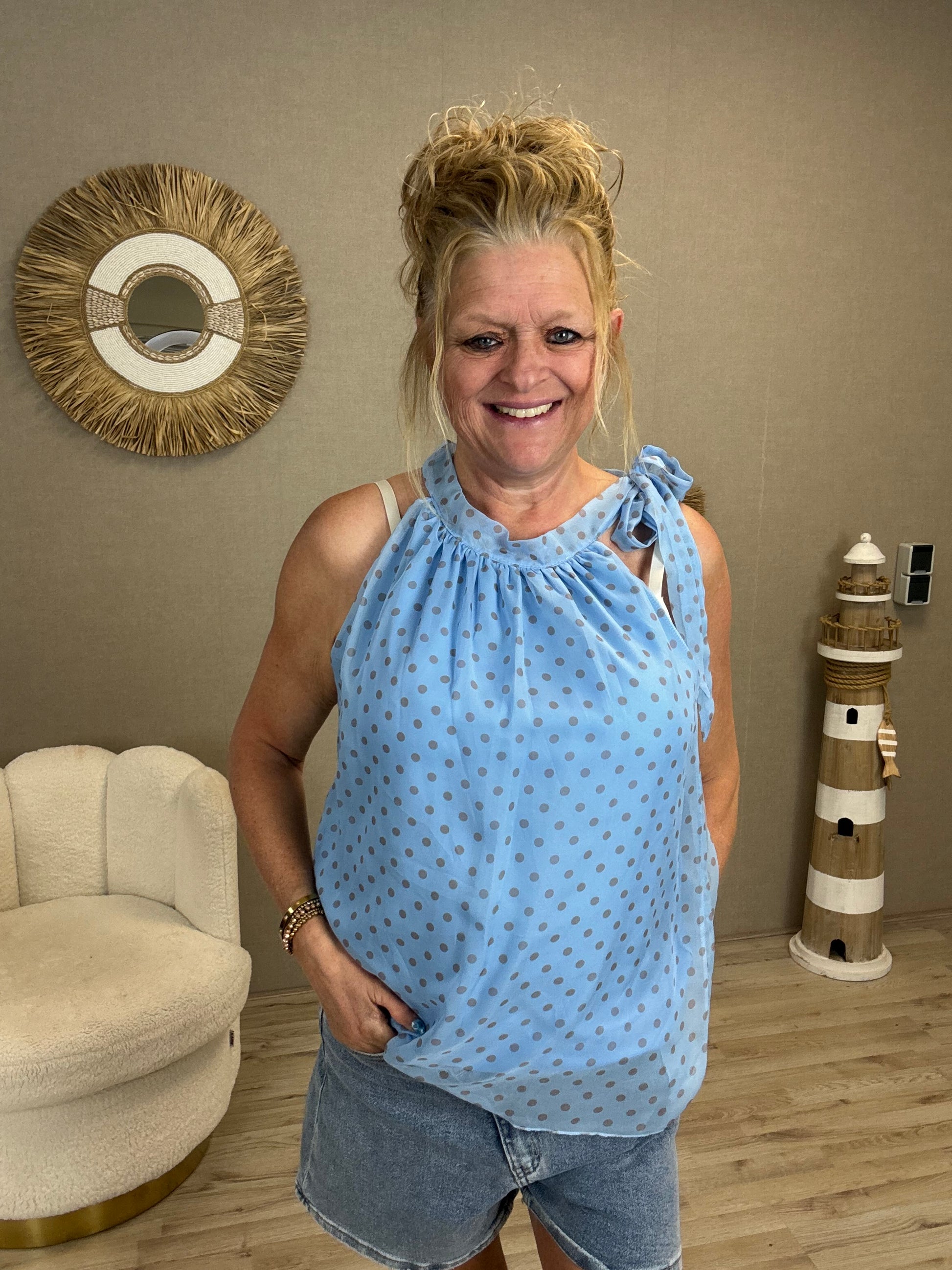 Details: Deze luchtige en vrouwelijke top is een echte must-have voor het voorjaar en de zomer. De speelse stippenprint en het elegante strikdetail bij de hals geven de top een stijlvolle en frisse uitstraling.