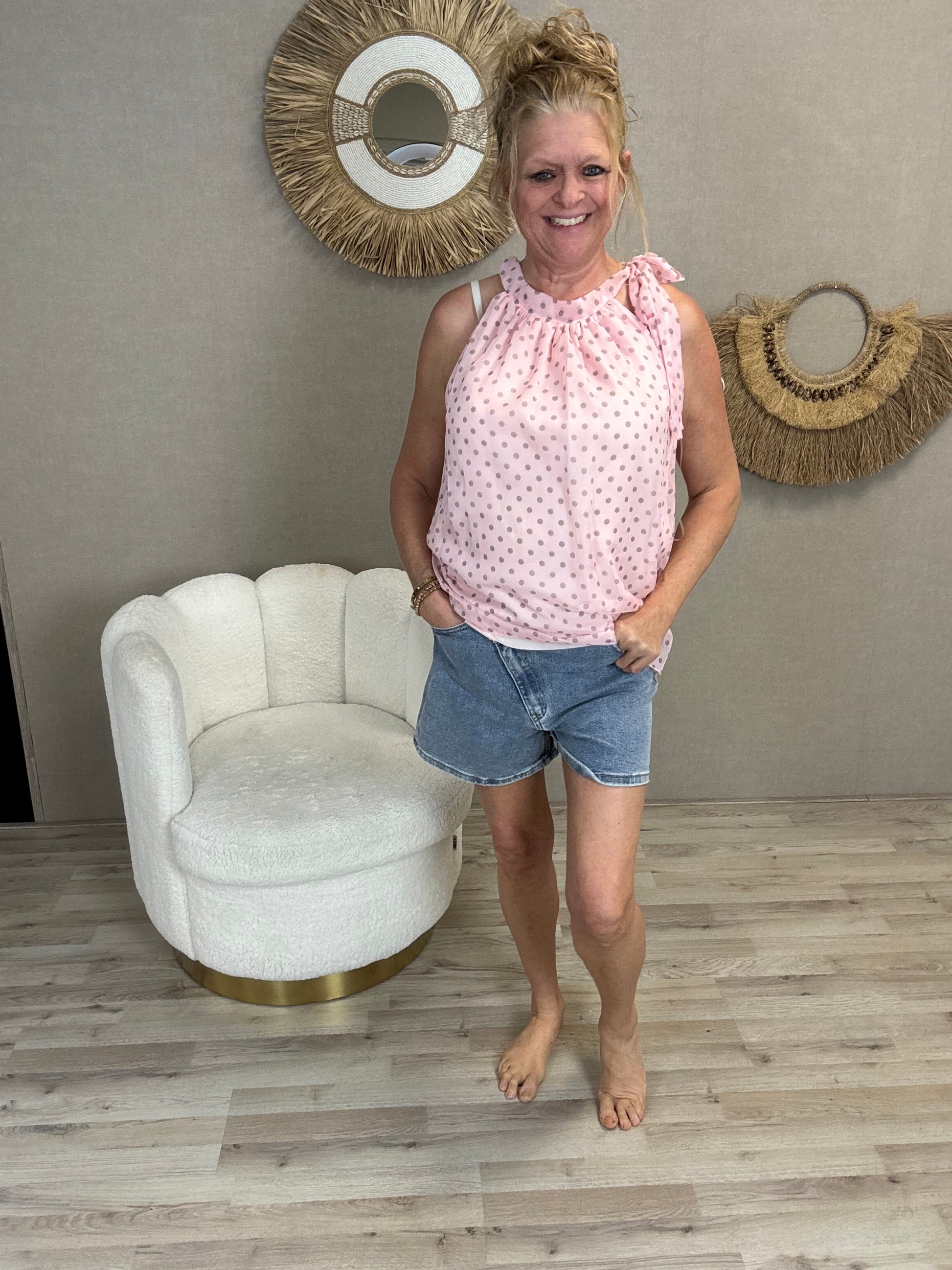 Details: Deze luchtige en vrouwelijke top is een echte must-have voor het voorjaar en de zomer. De speelse stippenprint en het elegante strikdetail bij de hals geven de top een stijlvolle en frisse uitstraling.