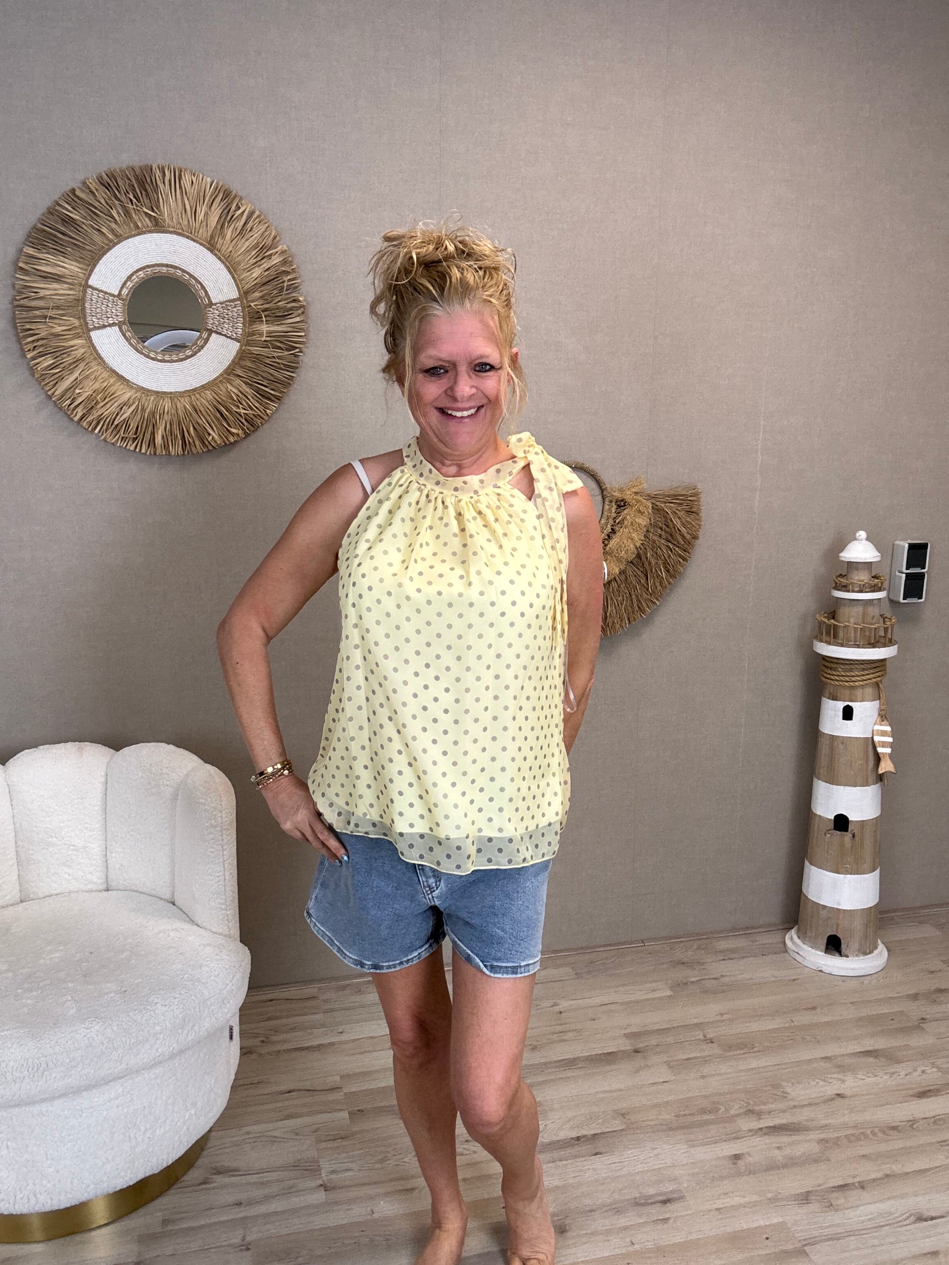 Details: Deze luchtige en vrouwelijke top is een echte must-have voor het voorjaar en de zomer. De speelse stippenprint en het elegante strikdetail bij de hals geven de top een stijlvolle en frisse uitstraling.