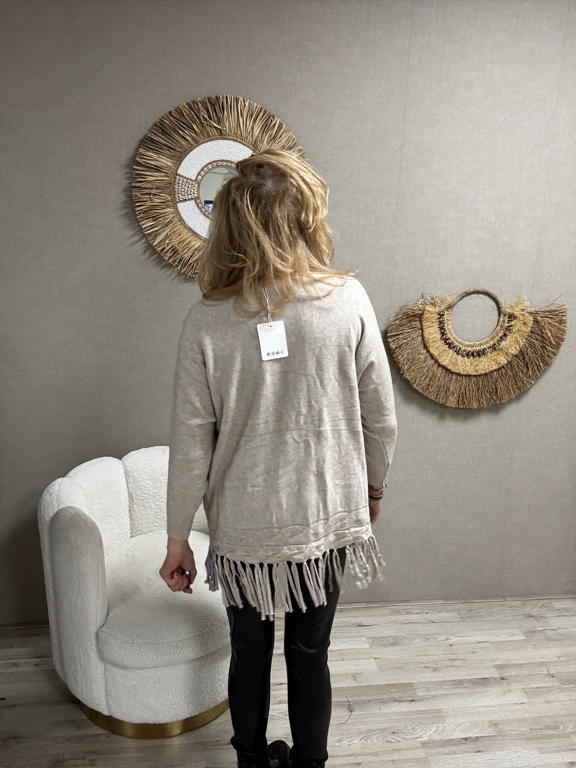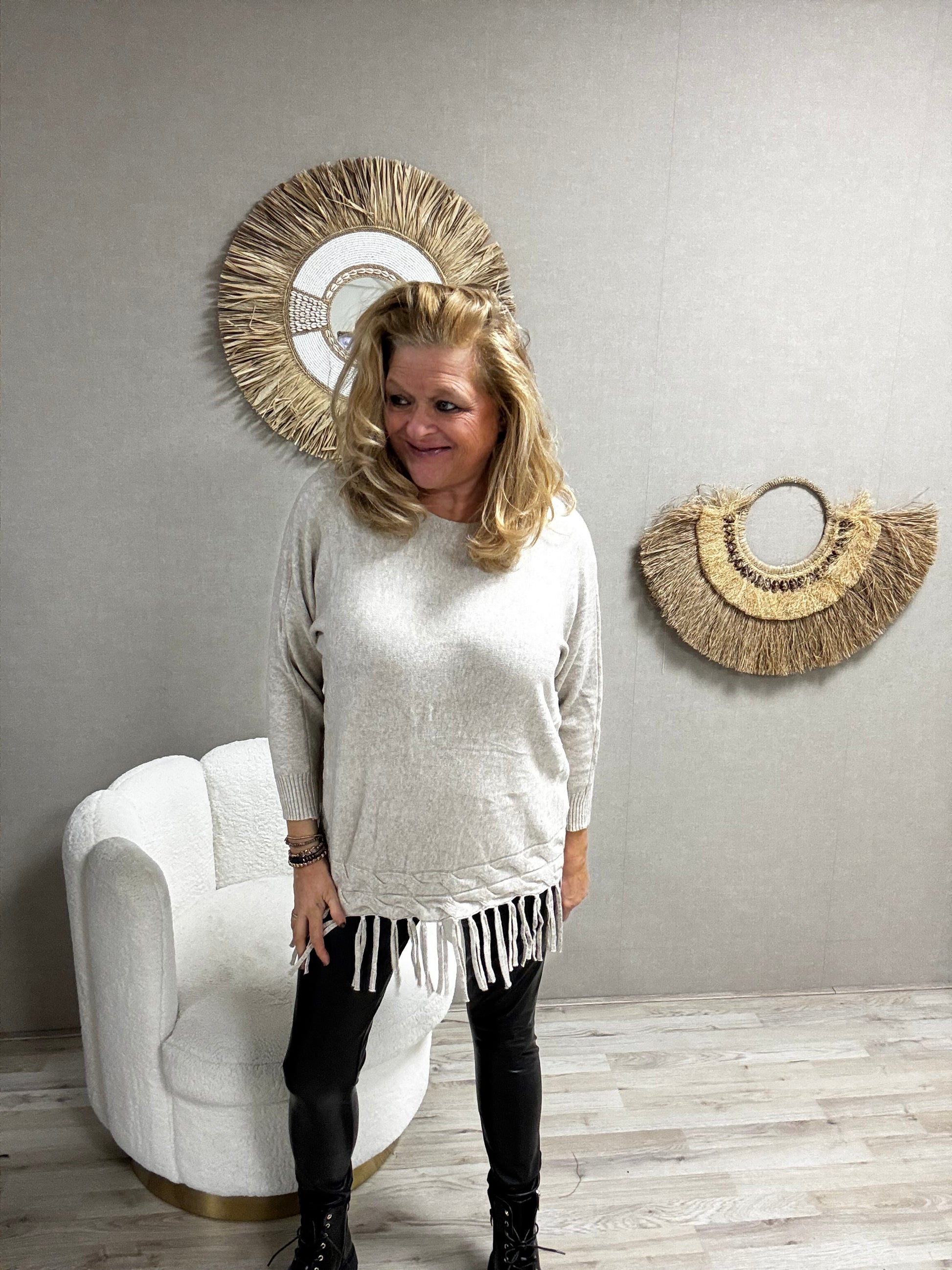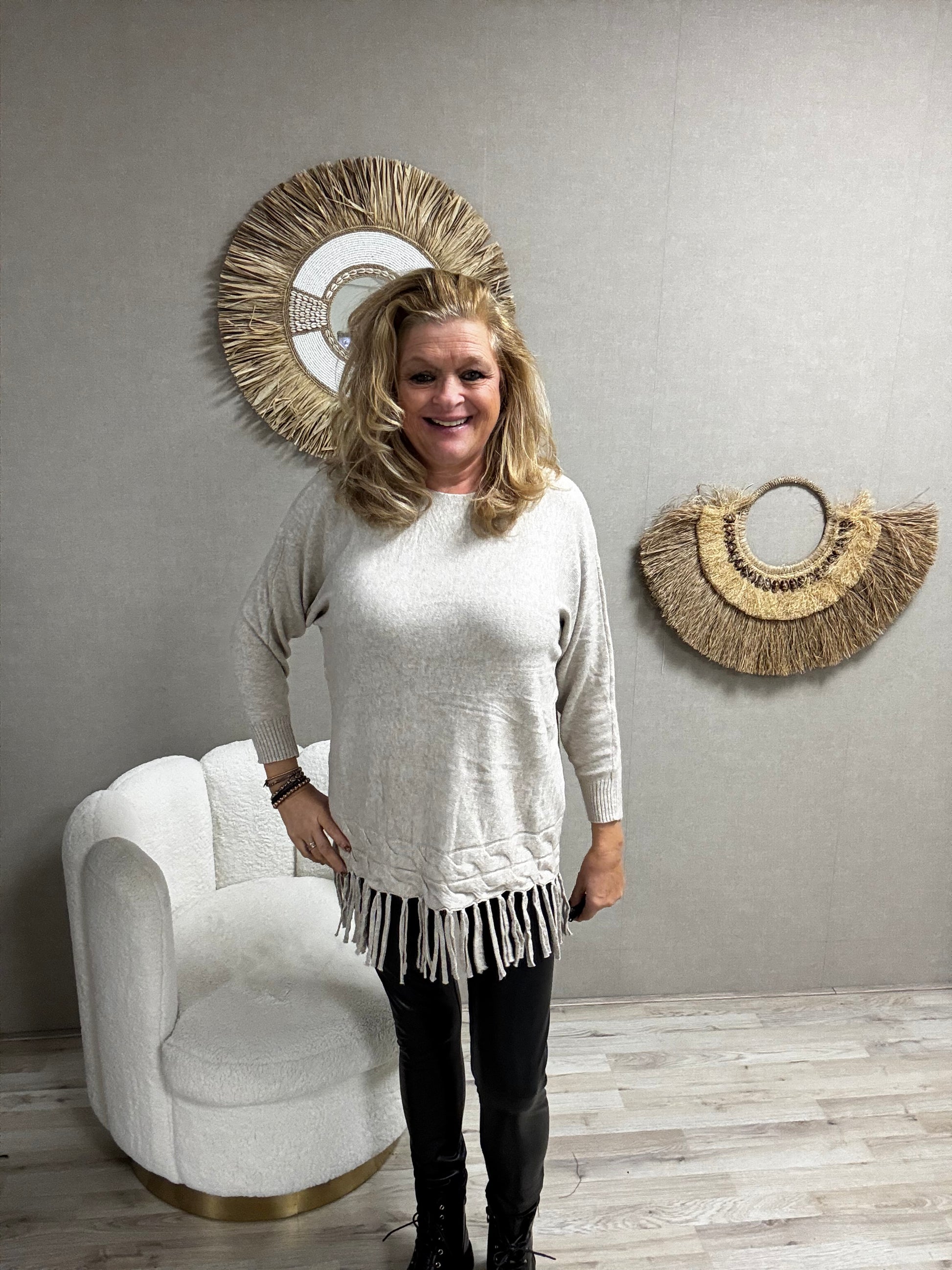 Details: Deze musthave trui is helemaal on-trend! De franjes aan de onderkant geven een speelse, boho touch, terwijl de boothals zorgt voor een vrouwelijke, nonchalante look. Verkrijgbaar in drie mooie kleuren, perfect om eindeloos te combineren.