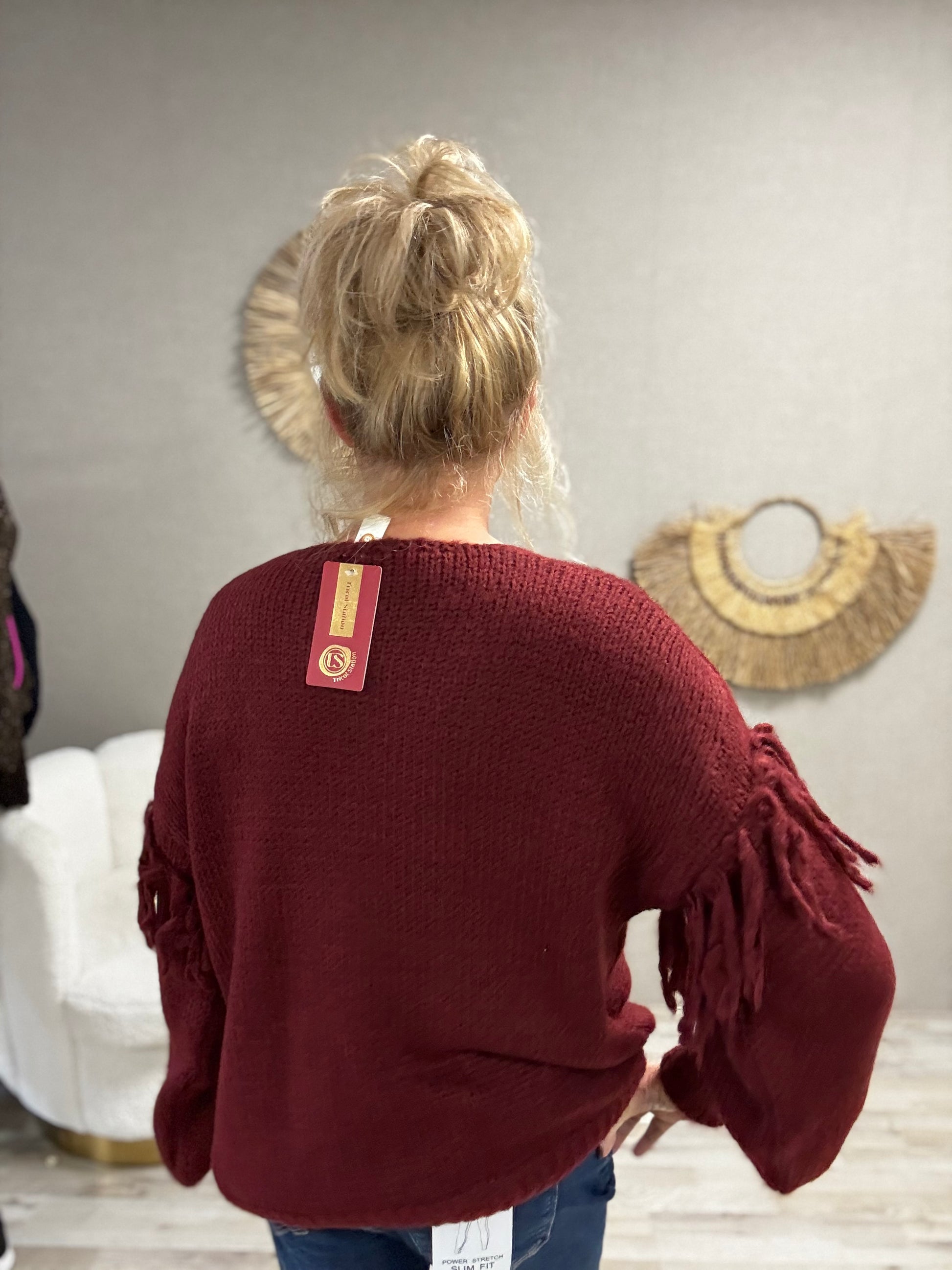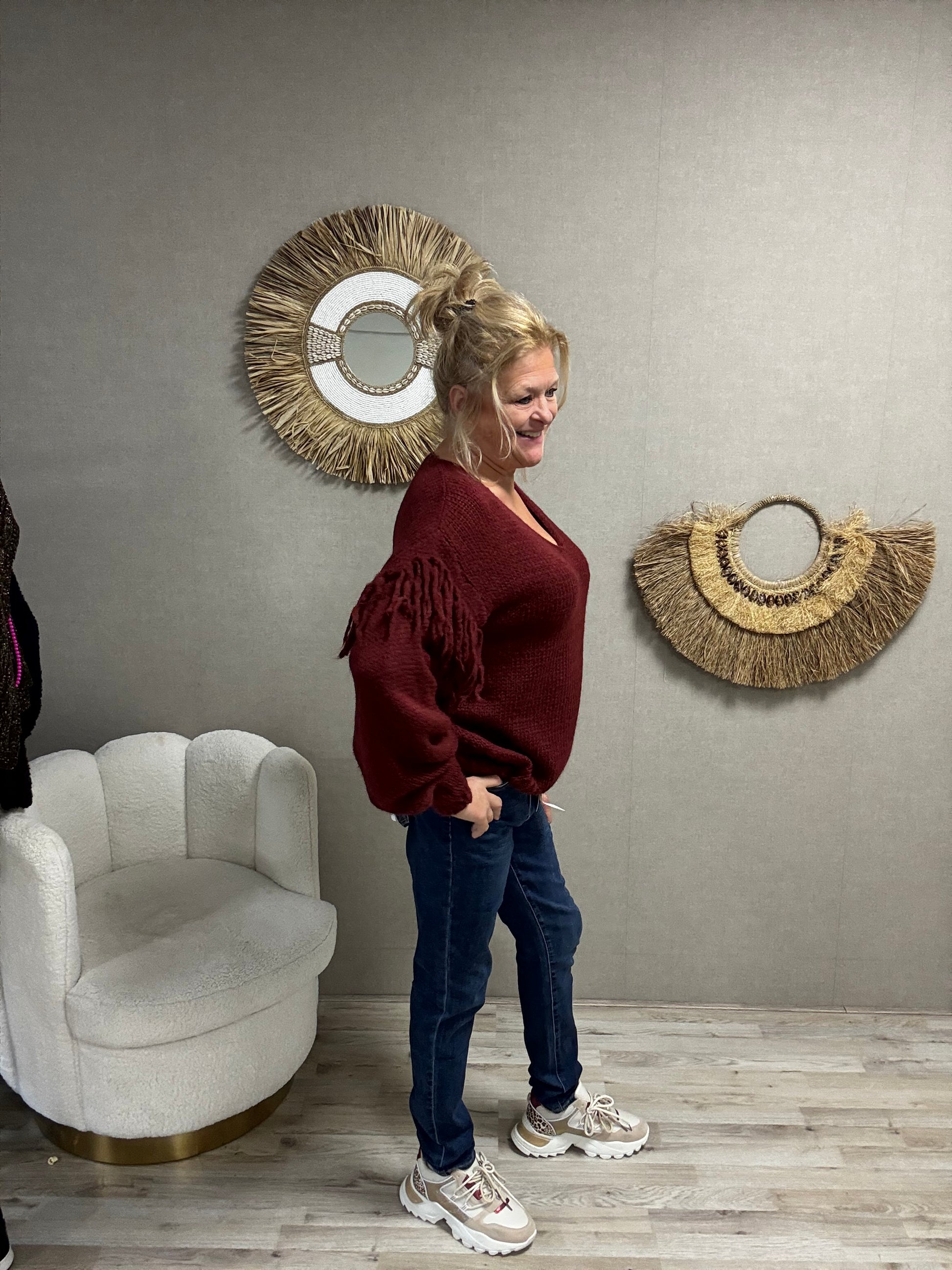 Details: Blijf heerlijk warm én stijlvol met deze zachte gebreide trui. De trui heeft een vrouwelijke V-hals en leuke franjes midden op de mouwen voor een speels detail. Verkrijgbaar in drie mooie kleuren, perfect om jouw winterlook compleet te maken.✨
