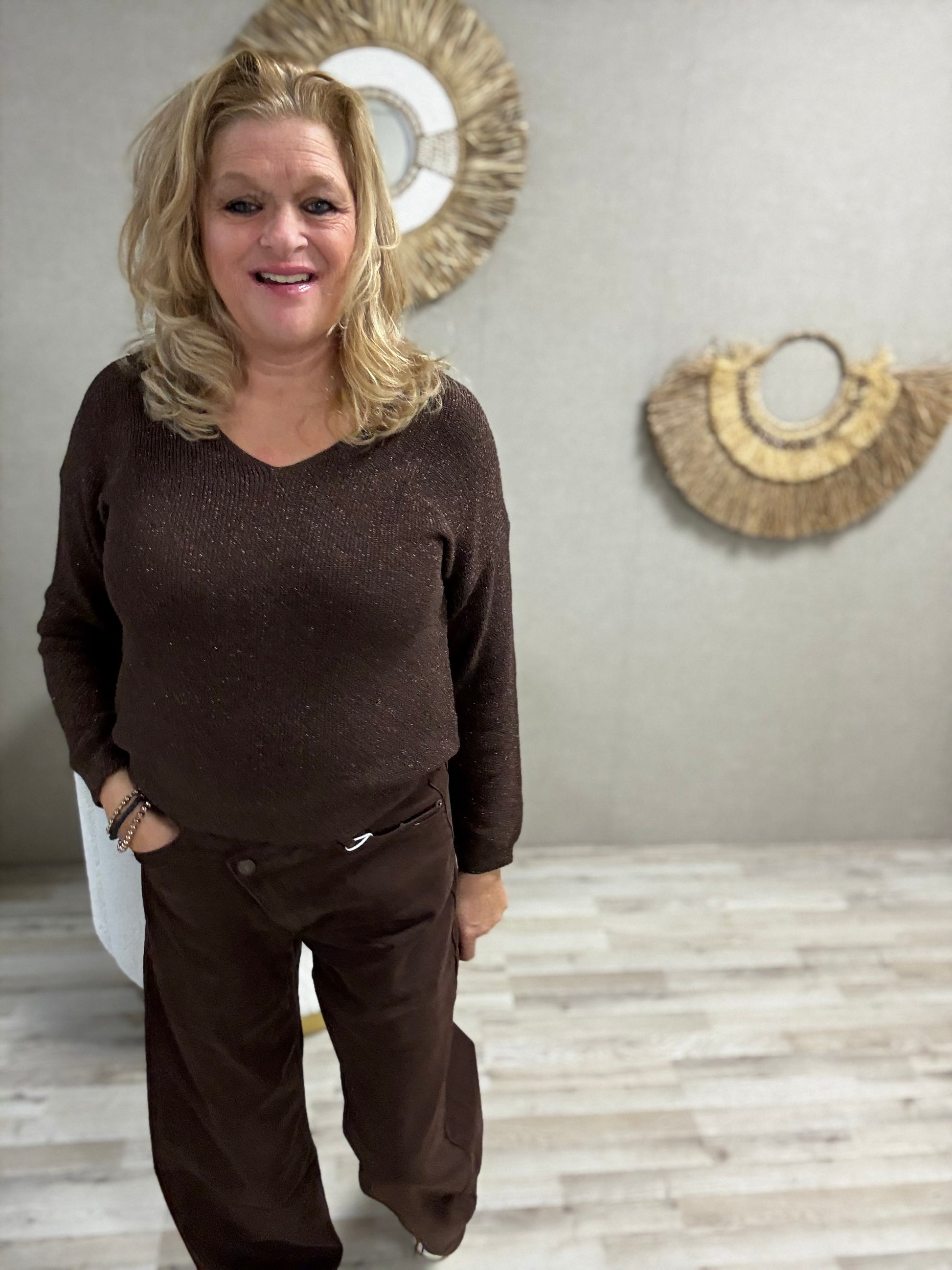 Laat jezelf stralen met het Nina truitje.De stijlvolle V-hals en de subtiele bruine lurex glitters geven deze top een chique, feestelijke uitstraling.