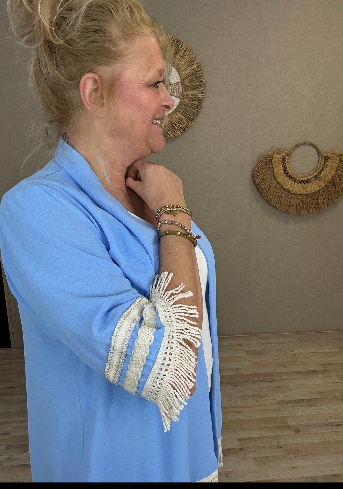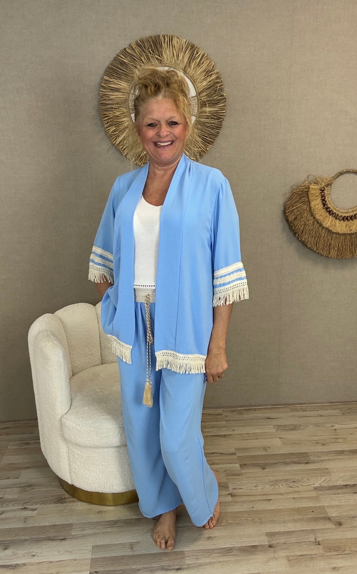 De combinatie van de zachte lichtblauwe kleur en de speelse franjes maakt deze outfit perfect voor een zomerse, relaxte maar stijlvolle look ☀️
